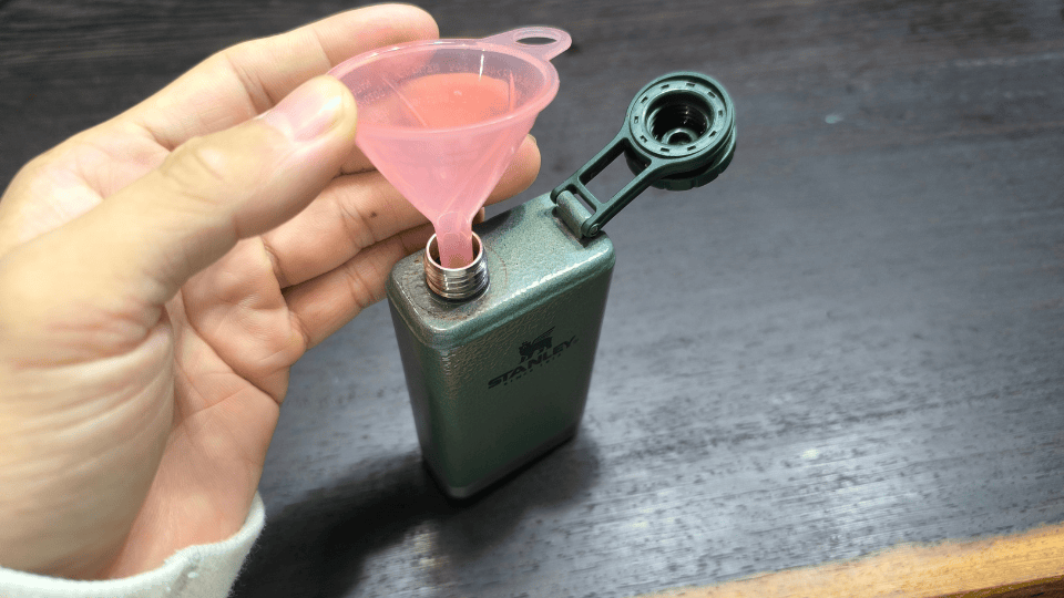 注ぎ口が狭く、瓶から直接スキットルに入れるのは難しいです。