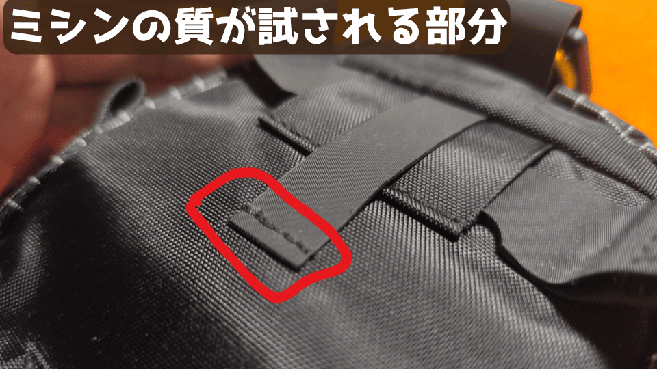負荷がかかりやすい部分でもあり、綺麗に3往復分くらい縫製してあります