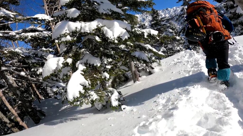さすが2000m級の山だ踏み音のする雪質のいい雪が残っており