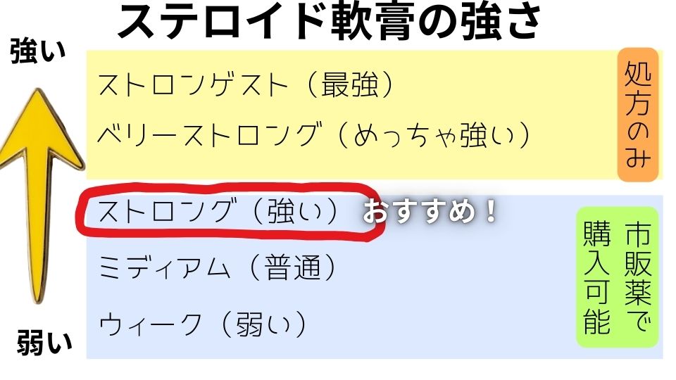 ステロイド軟膏は、5種類あり市販薬で購入できるのはストロング以下の3種になります。