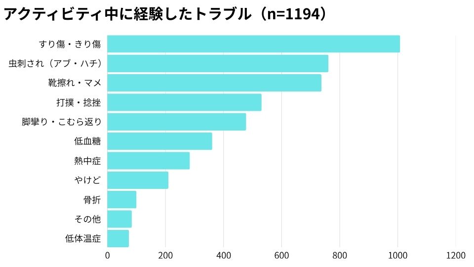 アクティビティ中の怪我として、すり傷や切り傷の次に虫刺されの頻度は多いです。