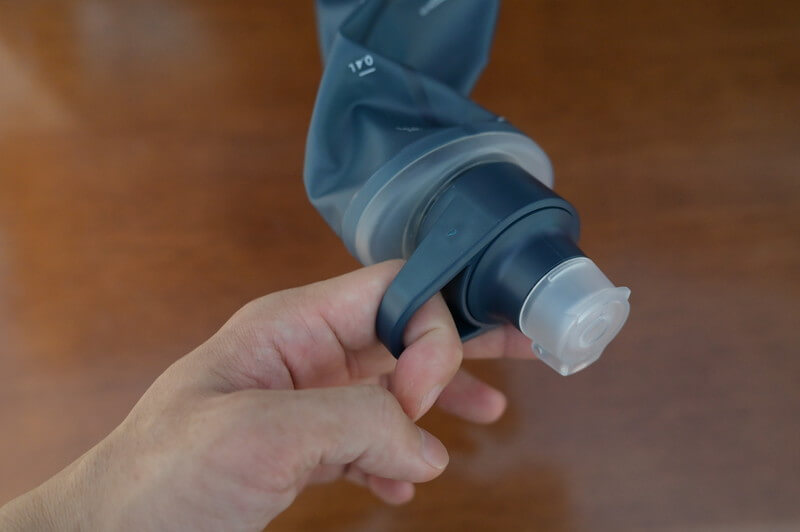 ボトル部分に指をひっかけて給水できるように工夫されています。渓流などの流れが早い場所での給水で、うっかりボトル側だけ流された!みたいな事がありません。