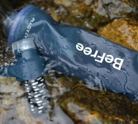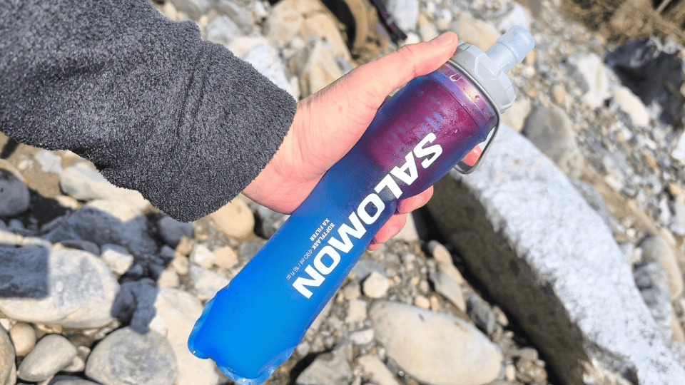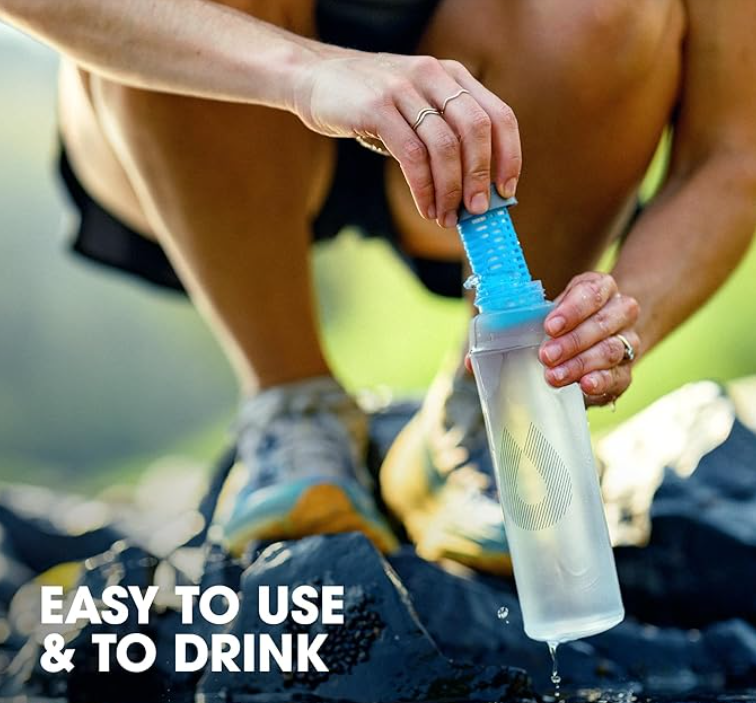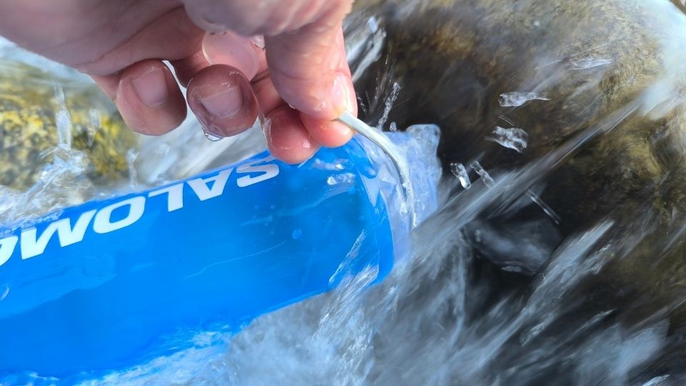 サロモンの人気浄水器の一つ、既存のソフトフラスクを使用することができ、汎用性が高いのもポイント!さらに、フラスク側に取っ手がついていて水が汲みやすい!浄水した水がペットボトルみたいにジョボジョボ飲めるのも良き。