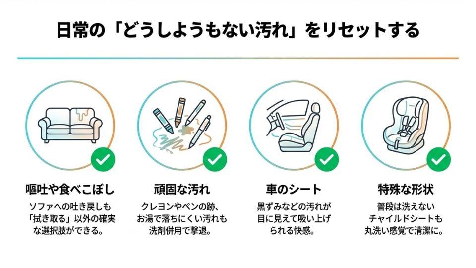 - 小さな子どもがいる家庭:嘔吐や食べこぼしの除菌・脱臭に適する。